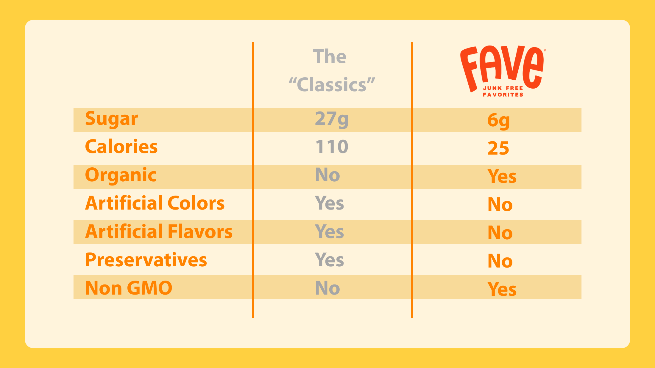 Fave’s got that super delicious nostalgia we love sippin’ on, with less sugar and no junk. That’s right - no preservatives, stabilizers, gums, or artificial sweeteners, colors and flavors. AKA all of the fun and none of the bad stuff!!!