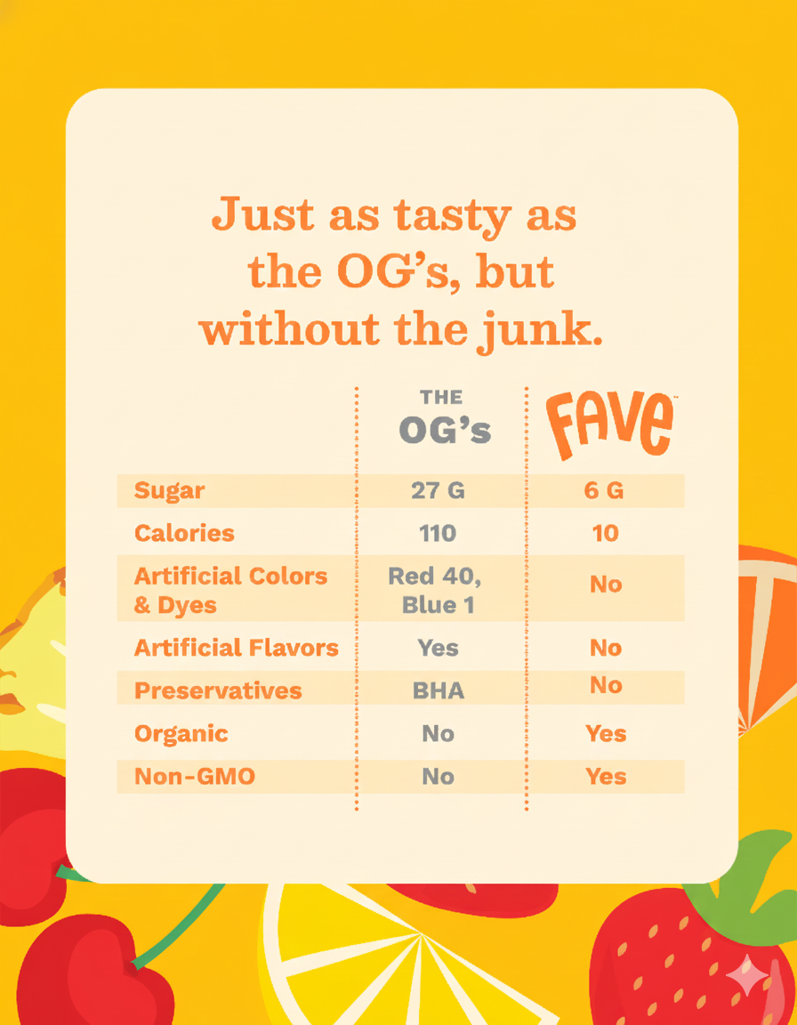 Fave was born from a simple idea: what if the nostalgic drinks we loved as kids could grow up with us? At Fave, we’ve taken the classic flavors from our childhood—those artificially bright, super sugary, fruity, fun drink mixes we all remember—and upgraded them to fit modern values. Our organic, low-sugar drink mixes are a playful throwback with a purpose: better-for-you beverages made with clean, simple ingredients and none of the junk. Every sip of Fave is a reminder that healthy choices don’t have to be boring—and that you never really outgrow your favorites!